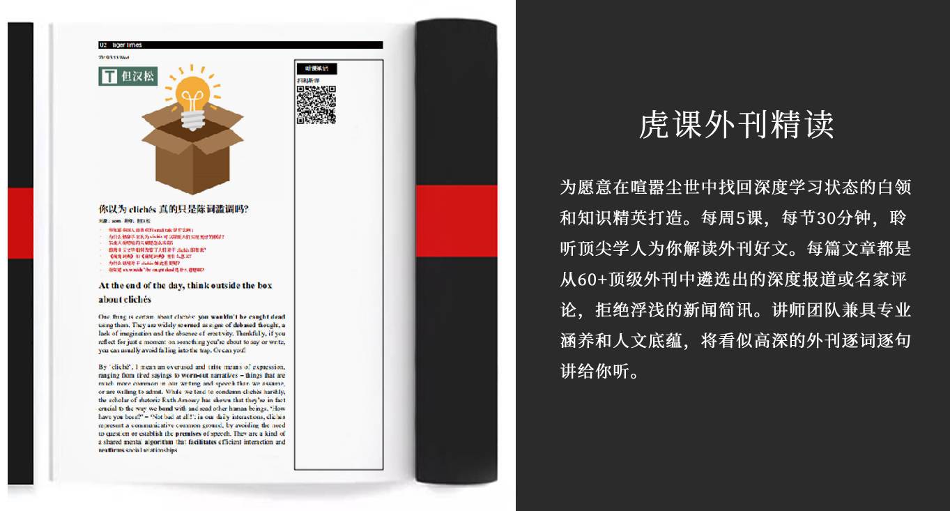 虎哥课堂创立于2016年,创始人毕业于牛津大学和南京大学,是一家有态度的在线教育机构。 我们的态度是:改变国人学习英语的方式和目的。 说直白点:不仅用它来考试,更要用它看世界。 我们还有个态度:讲课应该言之有物,不要说别人听不懂的话。让肚子里干货满满的老师,用说人话的方式,带你边学英语边看世界。 换成更有腔调的: 依托线上平台,我们专注于英文报刊及原版书解读,用英语课程和知识语言产品为中国爱知群体开扩国际视野。头部内容生产能力获喜马拉雅等国内顶尖知识付费平台认可。 个人公众号“在下林伯虎”,重点解读外媒最新报道和智趣文化现象。